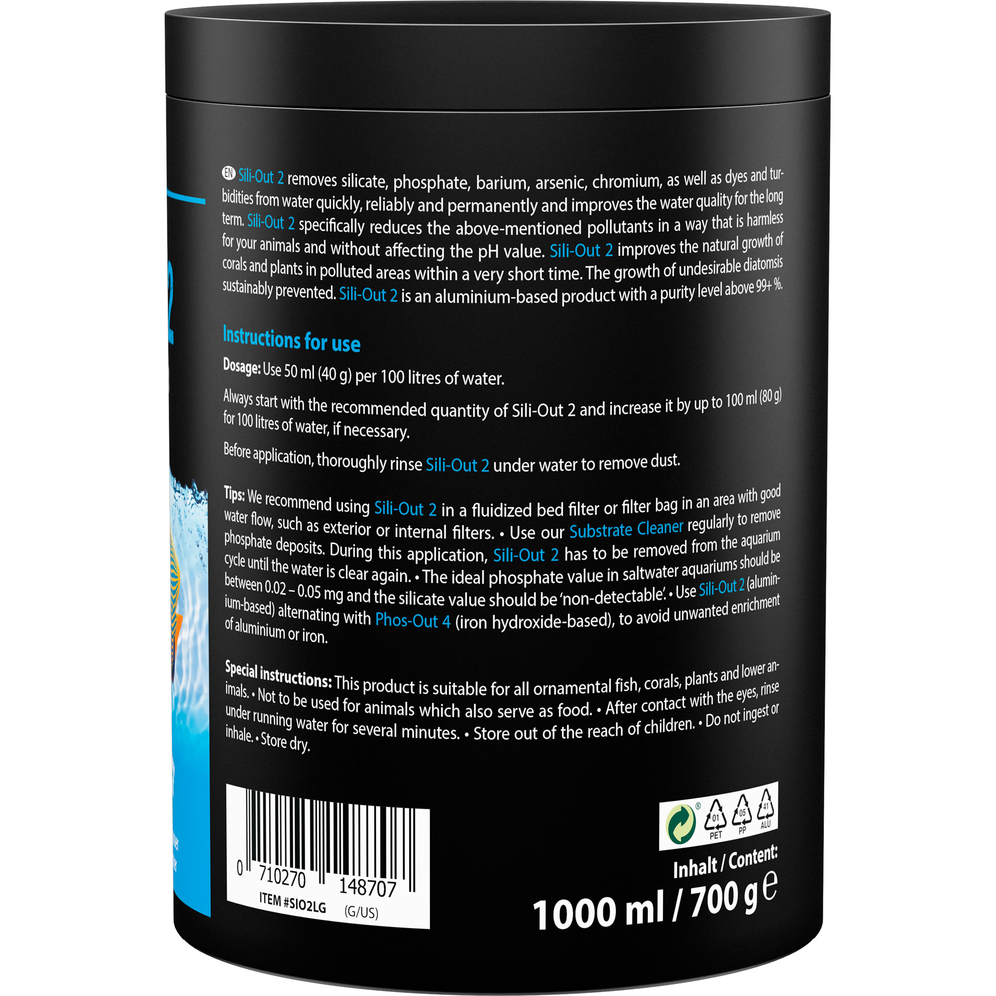 Sili-Out 2 ist ein auf Aluminiumbasis entwickeltes Produkt mit einem Reinheitsgrad von über 99%. Es entfernt schnell, sicher und dauerhaft Silikat, Phosphat, Barium, Arsen, Chrom sowie Gelbstoffe aus dem Wasser und verbessert nachhaltig die Wasserqualität in Deinem Meer- oder Süßwasseraquarium.