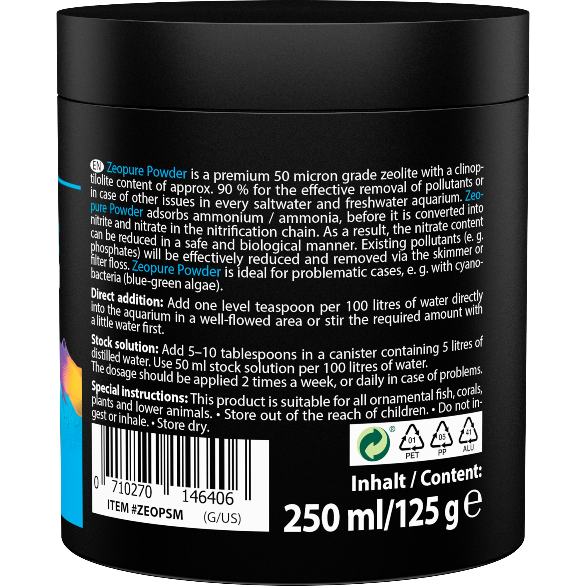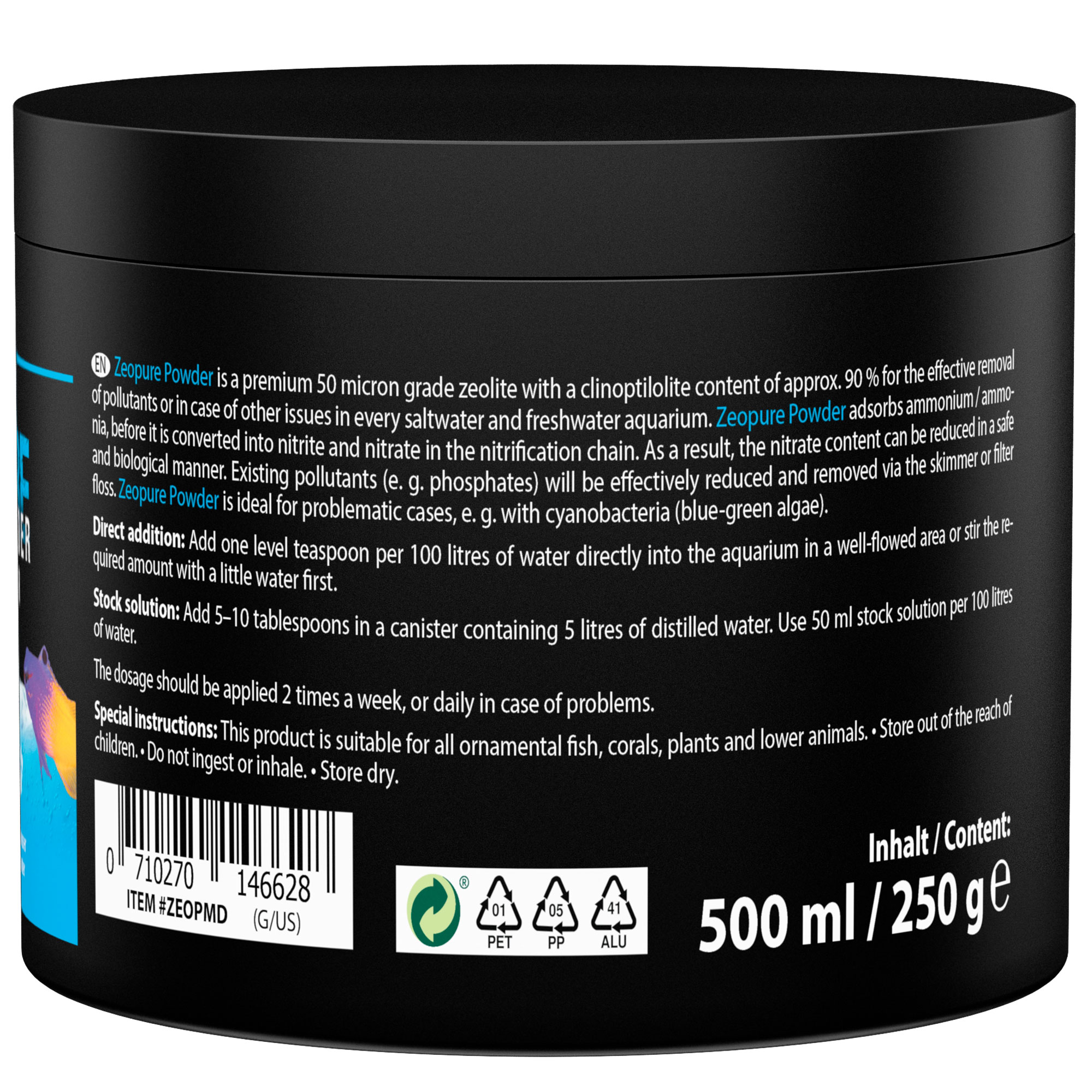 Zeopure Powder ist ein hochwertiges Zeolith-Pulver mit einer Körnung von 50 Micron und einem Klinoptilolithgehalt von ca. 90%. Es ist ideal zur effektiven Entfernung von Schadstoffen und zur Anwendung bei Problemfällen in allen Meer- und Süßwasseraquarien.