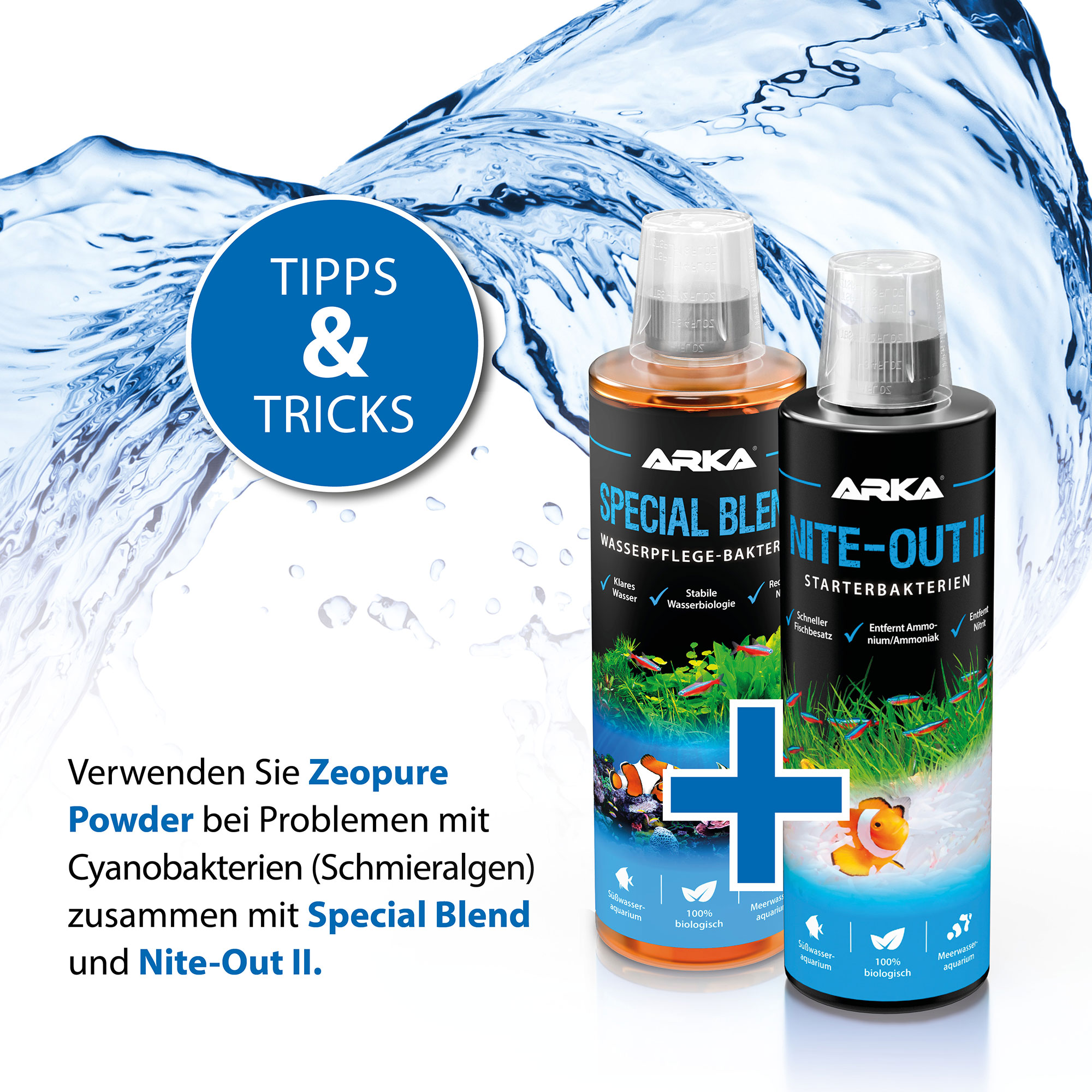 - Verwende Zeopure Powder bei Problemen mit Cyanobakterien zusammen mit Special Blend und Nite-Out II.