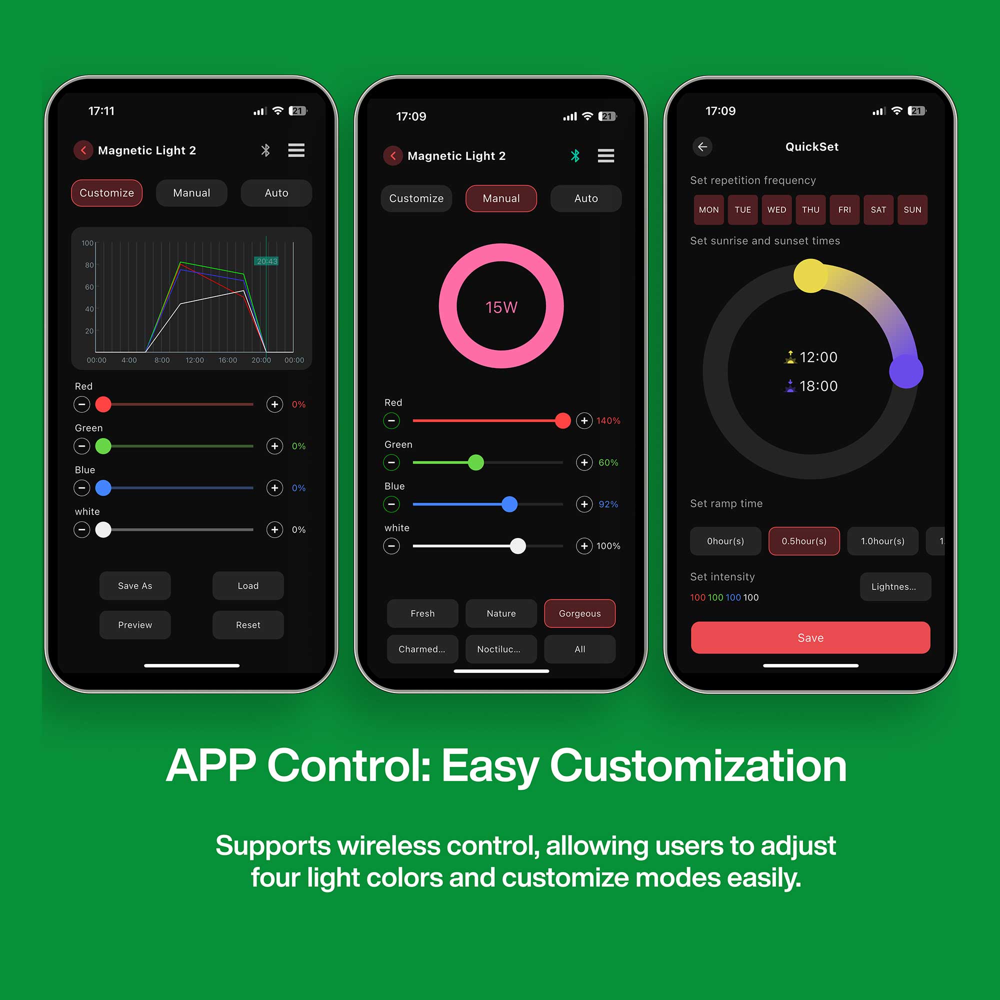 Die intelligente Steuerung erfolgt über die Chihiros App (Bluetooth). Dort kannst du alle Farbkanäle einzeln anpassen, Tageslichtverläufe wie Sonnenauf- und -untergänge programmieren und eigene Beleuchtungsprofile speichern.