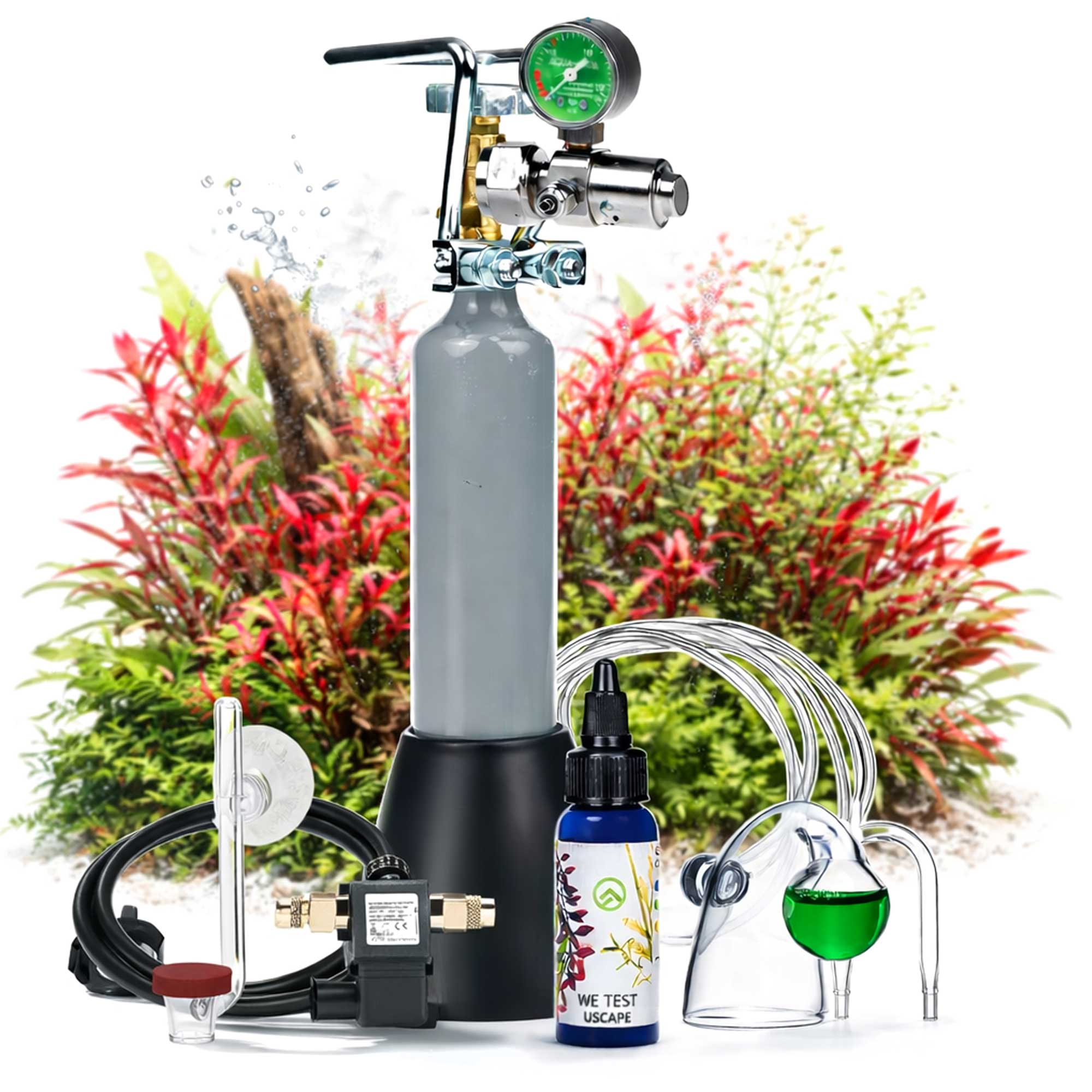 ▷ CO2 Komplettsystem mit einstellbaren Druckminderer deiner Wahl, 500g CO2-Flasche, Nachtabschaltung mit Rückschlagventil, Diffusor deiner Wahl, Druckschlauch, Silikonluftschlauch, CO2-Dauertest, CO2-Testflüssigkeit und U-Pipe.