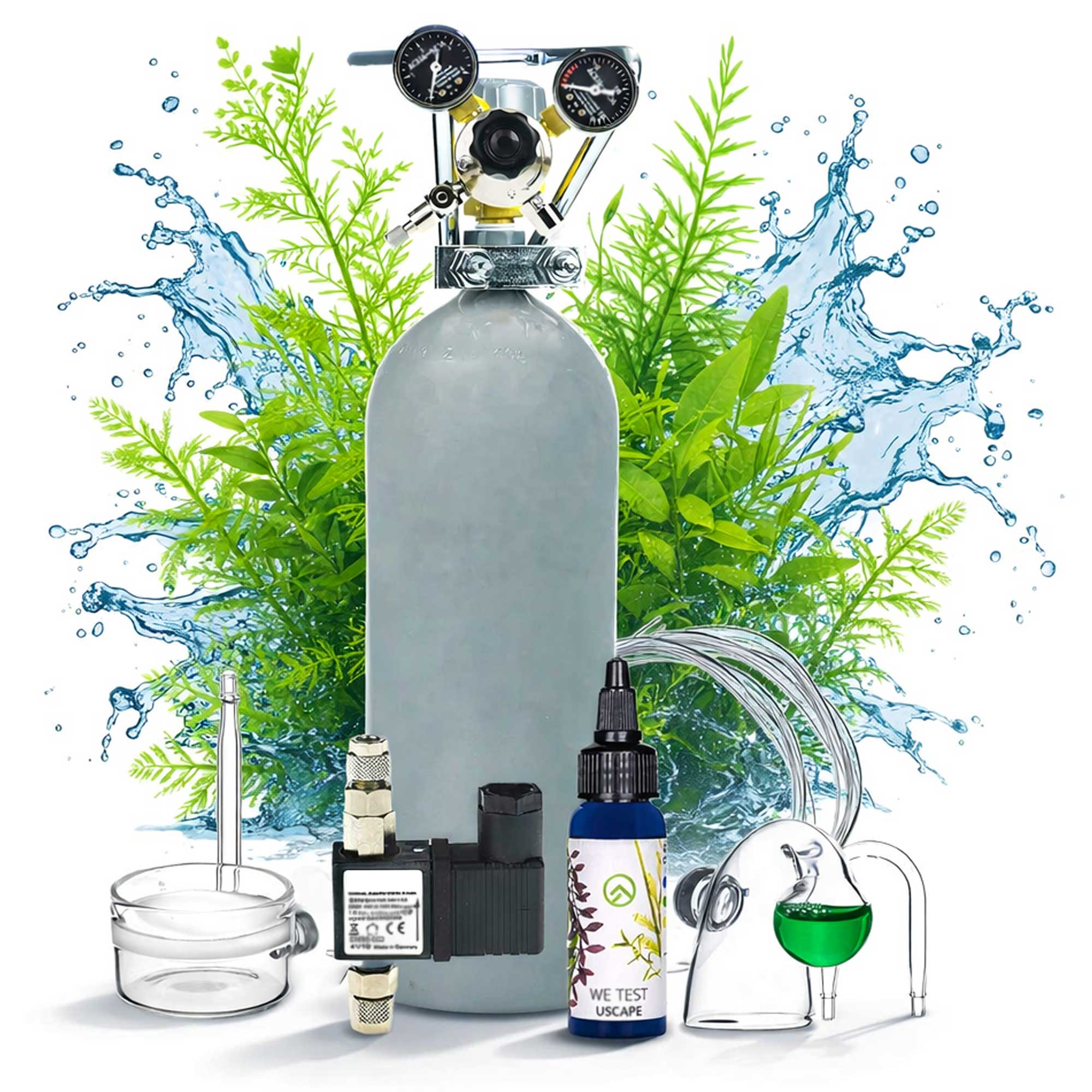 ▷ CO2 Komplettsystem mit einstellbaren Druckminderer deiner Wahl, 2kg Mehrweg CO2-Flasche, Nachtabschaltung mit Rückschlagventil, Diffusor deiner Wahl, Druckschlauch, Silikonluftschlauch, CO2-Dauertest, CO2-Testflüssigkeit und U-Pipe.