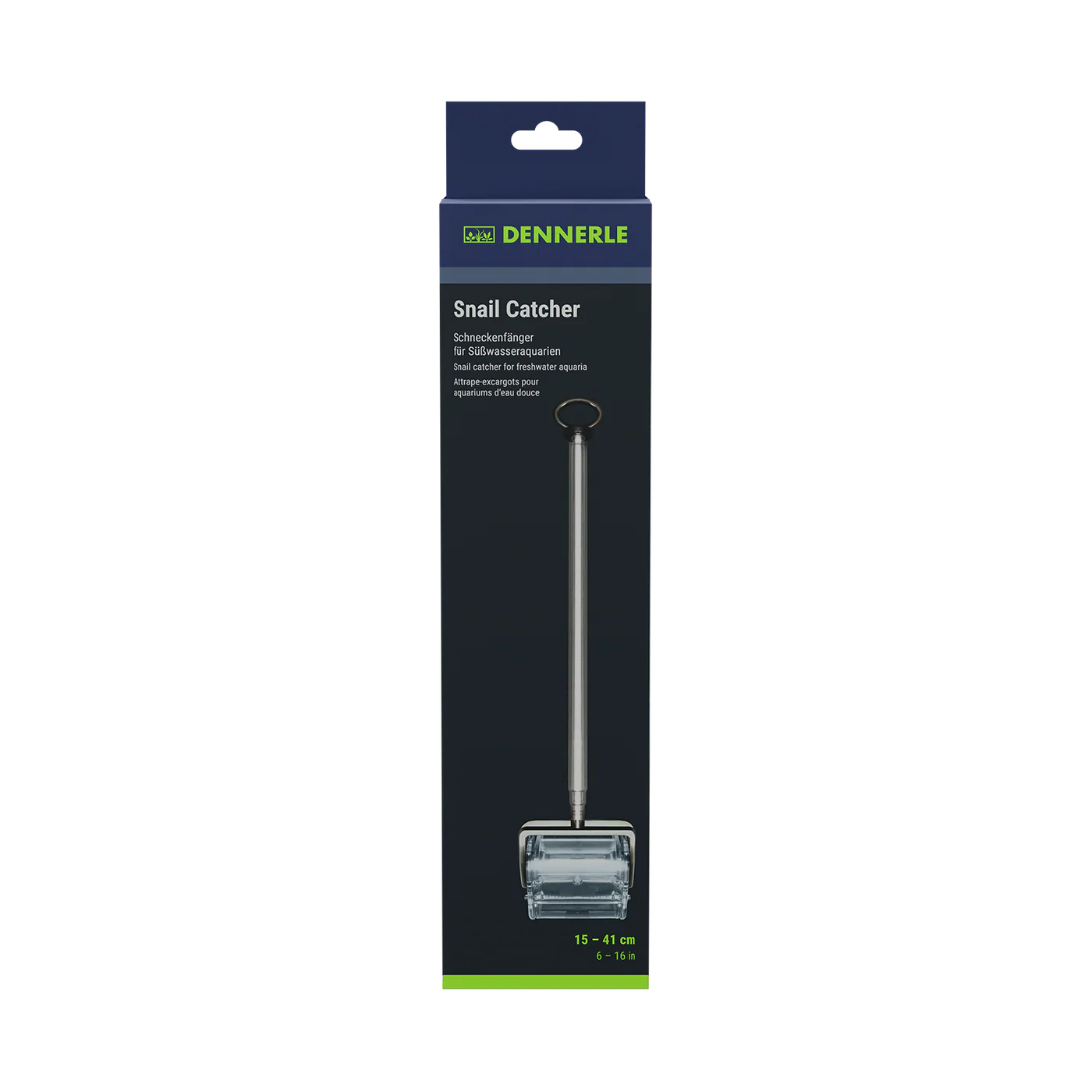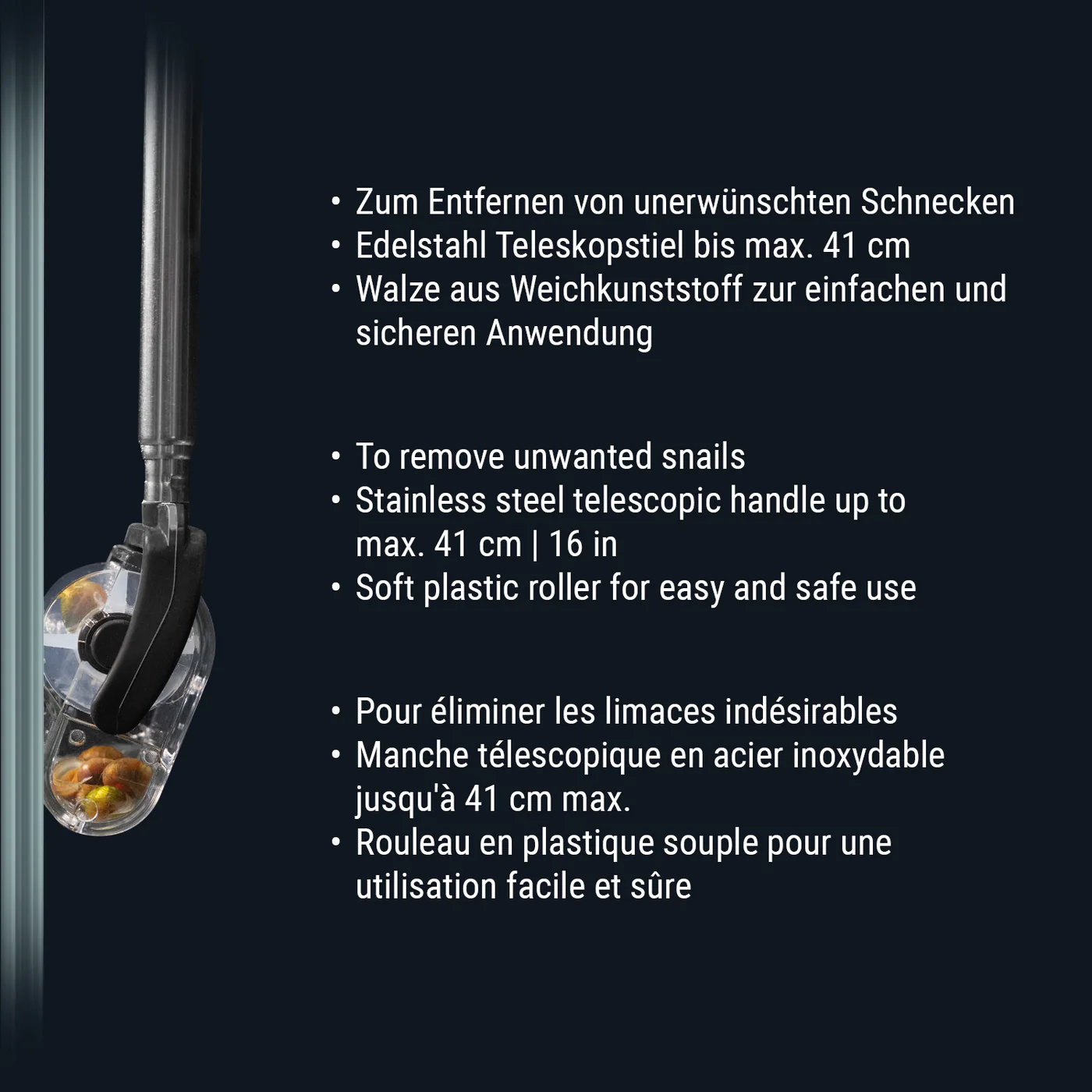 Mit dem Dennerle SnailCatcher kannst du ganz einfach unerwünschte oder überzählige Weichtiere von deinen Aquariumscheiben absammeln. Durch die Walze werden die Tiere in den Fangkorb geleitet, aus dem du sie später ganz einfach entnehmen kannst. Dabei sollten die Schnecken maximal 6mm groß sein. Dank des zwischen 15-41cm ausziehbaren Teleskopstiels behälst du während des Reingens sogar trockene Hände.