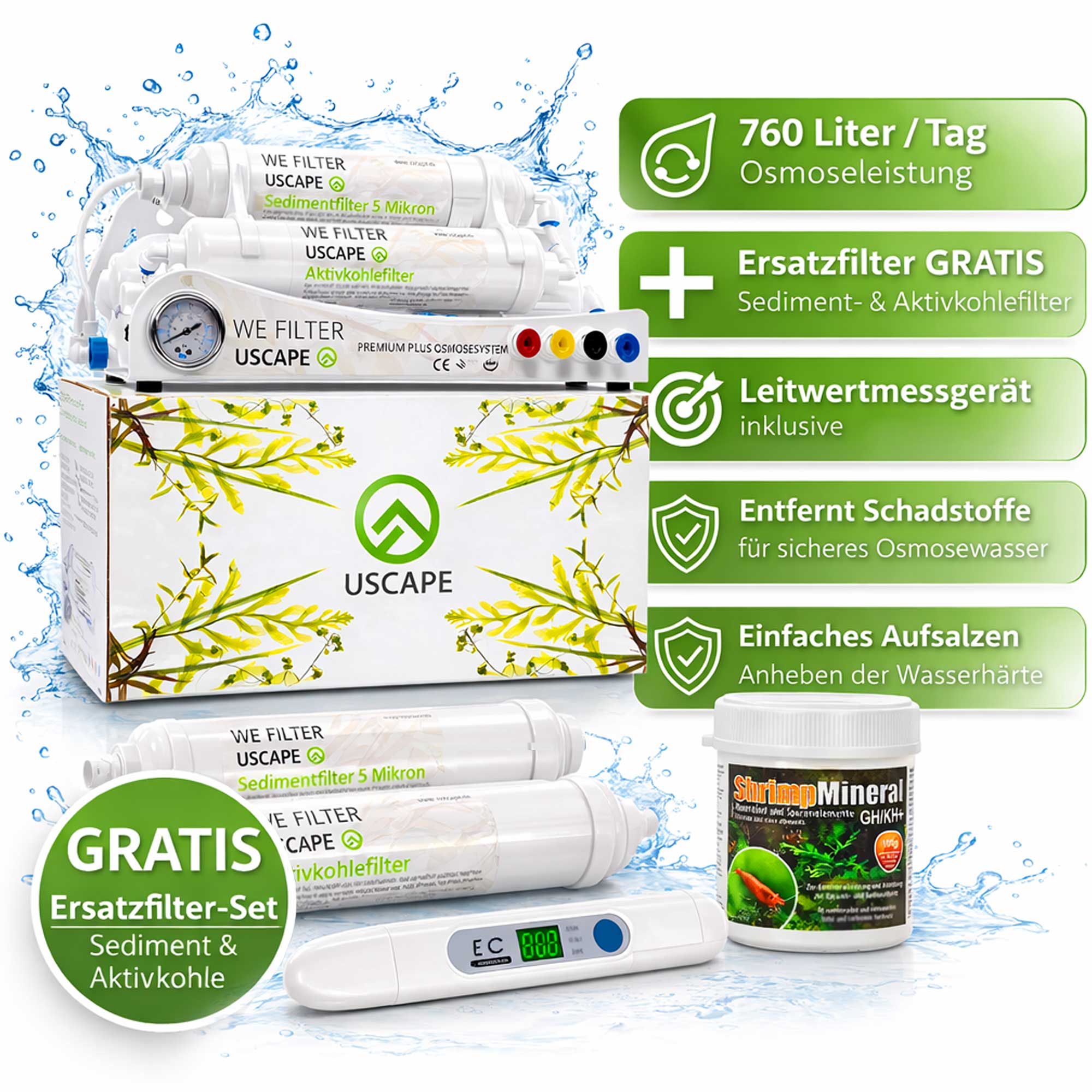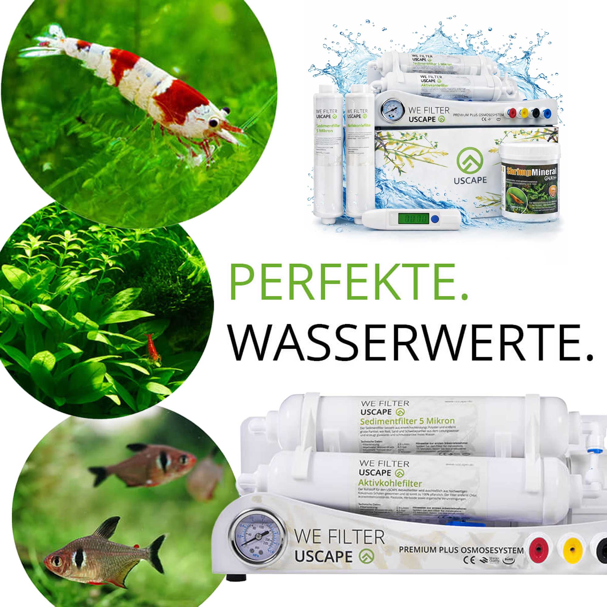 Mit dem USCAPE Komplettset für Osmosewasser kannst du dein Leitungswasser gezielt in weiches und sauberes Aquariumwasser verwandeln ideal für Garnelen, empfindliche Fische und anspruchsvolle Aquarienpflanzen. Die leistungsstarke Osmoseanlage reduziert viele unerwünschte Stoffe aus dem Leitungswasser und schafft so eine stabile Grundlage für dein Aquarium.