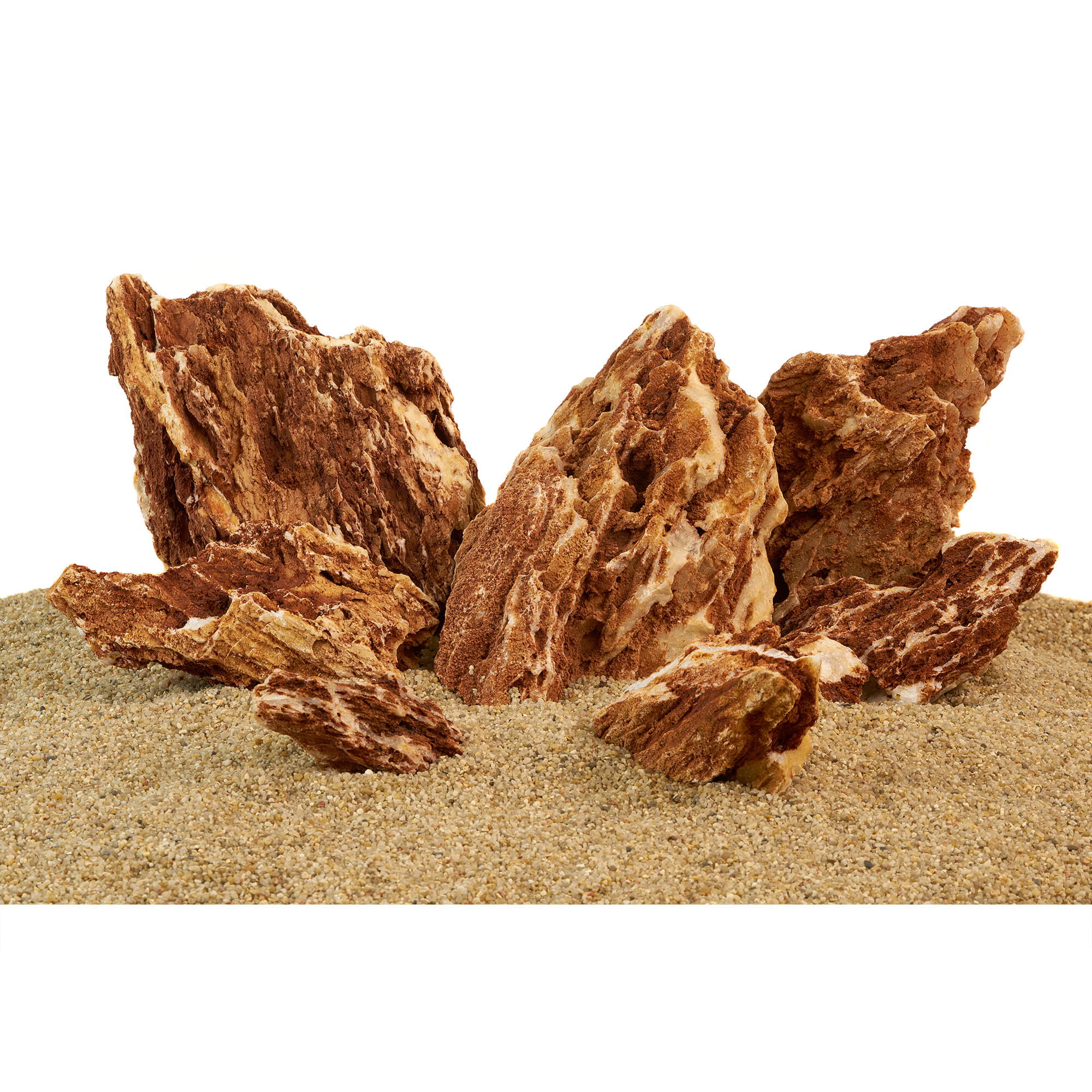 Mit seinen farblichen Kontrasten zwischen rötlichem Grundton und weißen Einsprengseln erzeugt der Samurai Stein eine sehr natürliche und gleichzeitig kraftvolle Wirkung im Aquarium. Die grob zerklüftete Oberfläche bietet viele Ansatzpunkte zum Bepflanzen mit Moosen oder Aufsitzerpflanzen wie Anubias oder Bucephalandra. Die Gesteinsform eignet sich hervorragend zum Bau von Terrassen, Klippen oder steil aufragenden Strukturen.