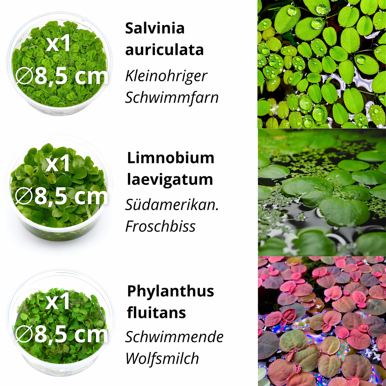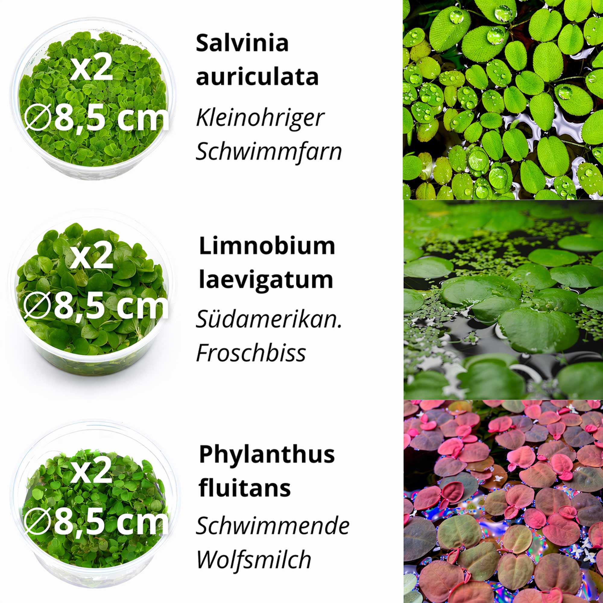 | L | 3x In-vitro Becher 8,5 cm (je 1x Limnobium laevigatum, Salvinia auriculata, Phyllanthus fluitans) | bis 1000 Liter |